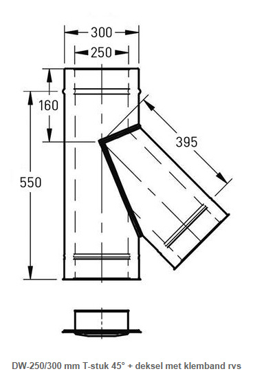 DW-250/300 mm T-stuk 45° + deksel met klemband rvsSpecificaties:Dubbelwandig T-stuk 45° + deksel rvs