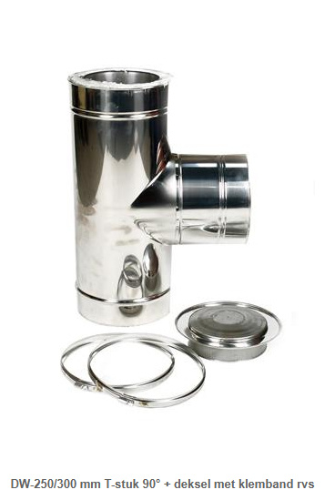 DW-250300 mm T-stuk 90° + deksel met klemband rvsSpecificaties:Dubbelwandig T-stuk 90° + deksel rvs