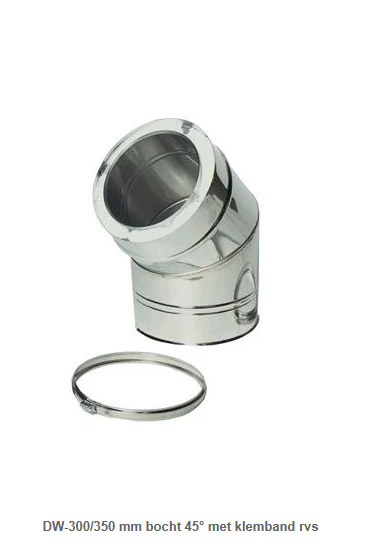 DW-300/350 mm bocht 45° met klemband rvsSpecificaties:Dubbelwandig bocht 45° met klemband rvs